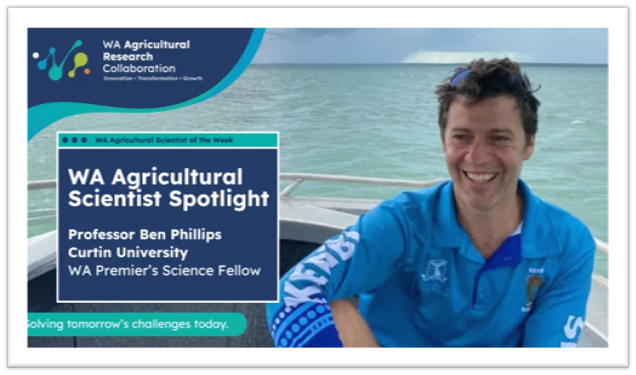 Every fortnight, the WA Agricultural Research Collaboration (WAARC) profiles one of Western Australia’s leading scientists whose curiosity, expertise and commitment are shaping the future of agriculture. The ‘WA Agricultural Scientist Spotlight’ series dives into the career journeys, inspirations and research driving WA’s most innovative thinkers, highlighting how their work contributes to more resilient, productive and sustainable agricultural systems. Ben was featured in the series, as his expertise in ecology and evolutionary biology sits at the crossroads of some of agriculture’s most pressing challenges – from invasive species to the movement of genes across landscapes. You can read the article about Ben hereon the WAARC website.