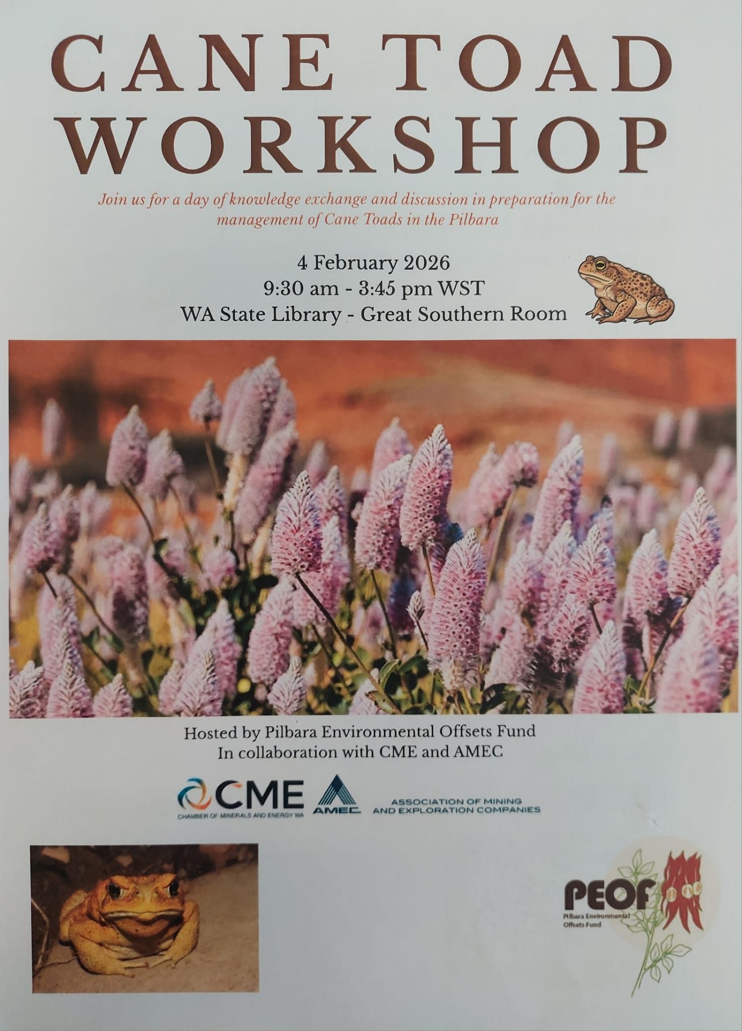 Ben and Judy recently presented their work on the impact of cane toads and the toad containment zone, at an industry workshop in Perth. The workshop was hosted by the Pilbara Environmental Offsets Fund (PEOF), the Association of Mining and Exploration Companies (AMEC) and the Chamber of Minerals and Energy (CME) and was aimed at awareness raising and early preparation for toads in the Pilbara.